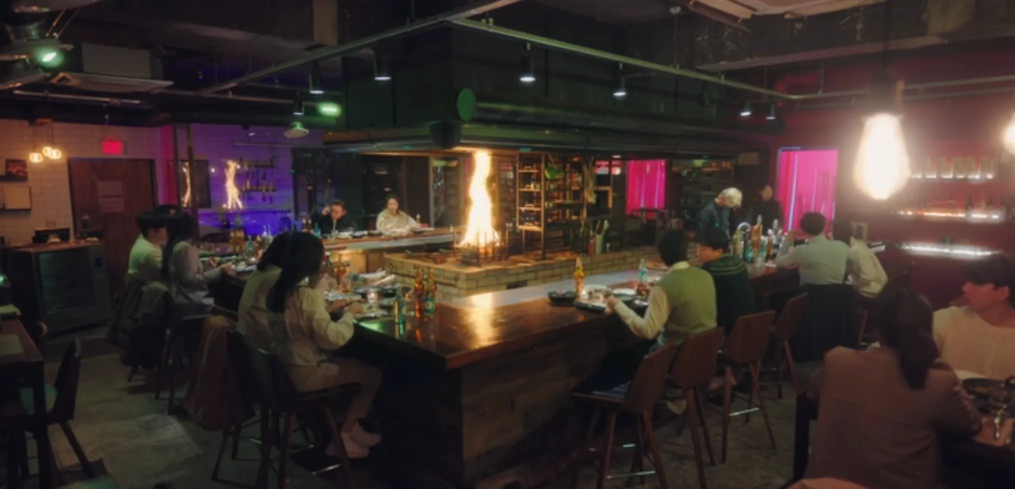 주란과 철우는 자유와 맞바꾼 매튜로 받은 50억이 찍힌 통장을 보며 지금을 즐기려 하지만 전혀 즐겁지가 않습니다. 한 가운데 불이 활활 타오르는 그릴이 있고 사각형으로 둘러 앉은 멋진 바는 옥스라이브파이어그릴에서 촬영되었습니다.